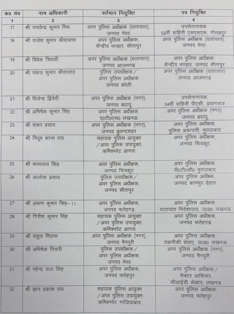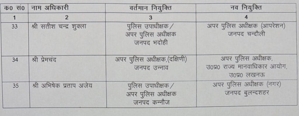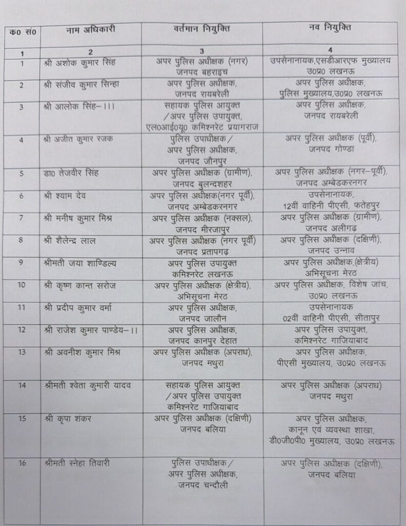 इसी क्रम में IPS ऋषभ रुनवाल सहायक पुलिस आयुक्त पुलिस कमिश्नरेट, लखनऊ को सोनभद्र (नक्सल) ASP का जिम्मा मिला है. आलोक कुमार को सहायक पुलिस अधीक्षक सम्भल से हटाकर ASP (नगर पूर्वी) प्रतापगढ, डॉ. ईशान सोनी को