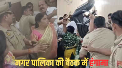 अमरोहा में नगर पालिका की बोर्ड बैठक में बुधवार को भारी हंगामा हुआ. बैठक के दौरान महिला काउंसलर ने पुलिस के सामने ही पूर्व विधायक और नगर पालिका अध्यक्ष के पति हरपाल सिंह का गिरेबान पकड़ लिया. इस दौरान माहौल तनावपूर्ण हो गया और मामला हाथापाई तक पहुंच गया.
