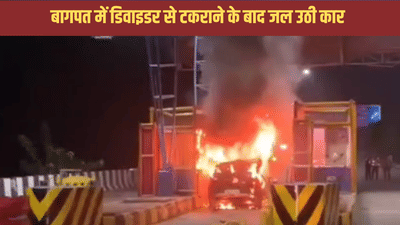बागपत में एक कार डिवाइडर से टकराने के बाद धधक उठी. किसी तरह से ड्राइवर ने कार से कुदकर अपनी जान बचाई. इस दौरान आग की लपटें टोल बूथ तक पहुंच गई, जिससे वहां भगदड़ की स्थिति बन गई.