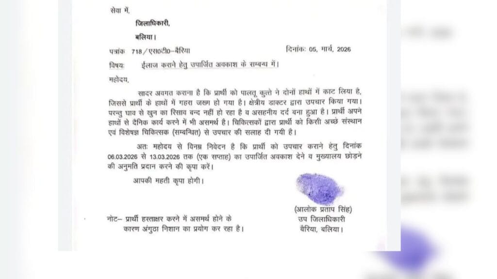 उत्तर प्रदेश के बलिया में एसडीएम बैरिया की छुट्टी का आवेदन सोशल मीडिया पर वायरल हो गया है. पालतू कुत्ते के हमले में घायल होने के कारण एसडीएम आलोक प्रताप सिंह ने हस्ताक्षर की जगह अंगूठे का निशान लगाकर छुट्टी मांगी है. यह अनोखा आवेदन छुट्टी के कारण और उसकी प्रस्तुति शैली के लिए चर्चा का विषय बना हुआ है.