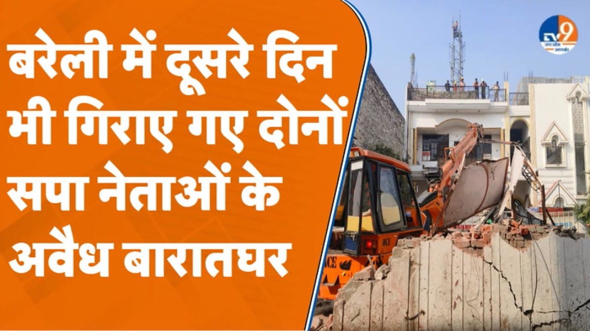 बरेली में लगातार दूसरे दिन बुलडोजर एक्शन जोरों पर है. सुबह 11:30 बजे से दो जेसीबी और अब पोकलैंड मशीन से तेजी से अवैध निर्माण ढहाया जा रहा है. बारात घर का बड़ा हिस्सा जमींदोज किया गया. ऐवान-ए-फरहत बारातघर का मुख्य गेट और आगे का हिस्सा तोड़ा गया. दोनों बारातघरों को 2-3 दिन में पूरी तरह ढहाने की कोशिश की जा रही है. भारी पुलिस बल तैनात है. इलाका छावनी में तब्दील कर दिया गया है. नियमों के उल्लंघन पर प्रशासन का सख्त एक्शन जारी है.