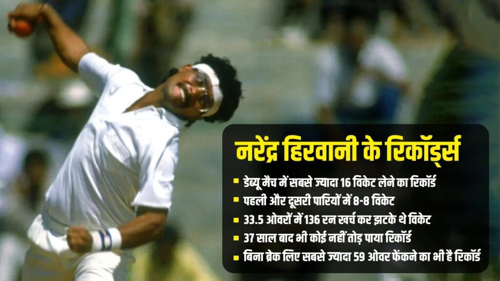 गोरखपुर से ताल्लूक रखने वाले लेग स्पिनर नरेंद्र हिरवानी ने अपने डेब्यू टेस्ट में दोनों पारियों को मिलाकर कुल 16 विकेट झटक डाले थे. इसके लिए उन्होंने 136 रन खर्चे थे. उनका यह प्रदर्शन अब तक वर्ल्ड रिकॉर्ड है. पिछले 37 सालों में यह रिकॉर्ड कोई तोड़ नहीं पाया है.
