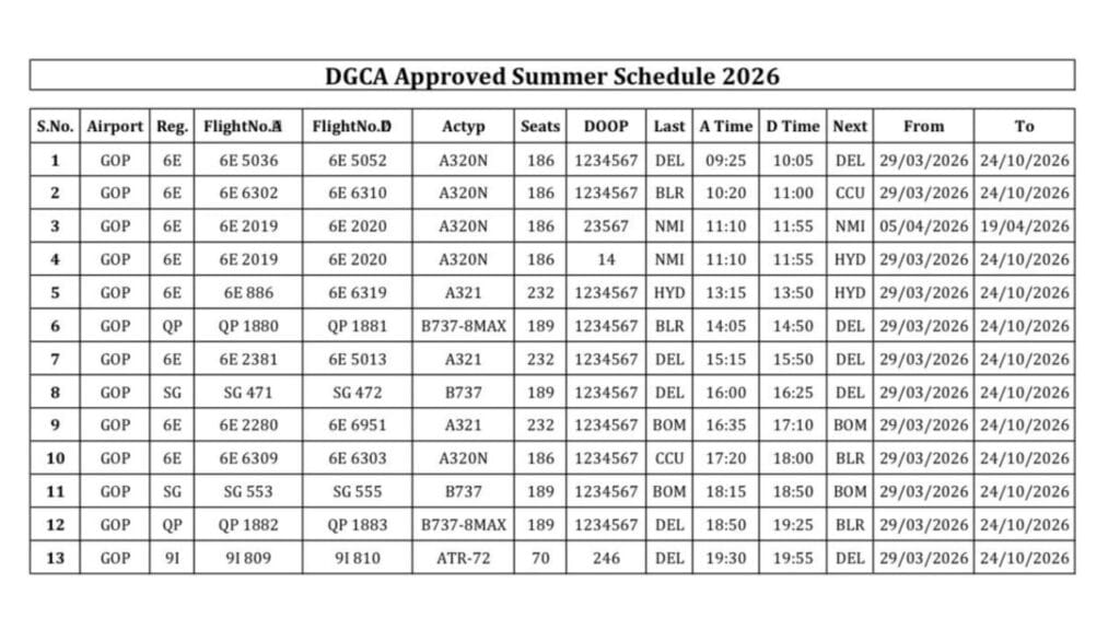गोरखपुर एयरपोर्ट के लिए समर शेड्यूल 2026 को नागरिक उड्डयन महानिदेशालय ने मंजूरी दे दी. इस नए शेड्यूल को 29 मार्च से लागू किया जाएगा और यह 24 अक्टूबर तक प्रभावी रहेगा. समर शेड्यूल के दौरान यात्रियों की संख्या में रिकॉर्ड बढ़ोतरी होती है, इसको देखते हुए हवाई सेवाओं के परिचालन को लेकर कई महत्वपूर्ण फैसले लिए गए हैं. साथ ही यात्रियों को दी जानी सुविधाओं के लिए सुधार किए गए हैं.