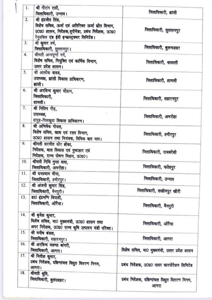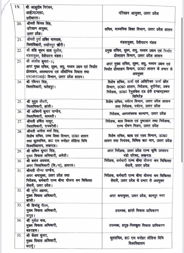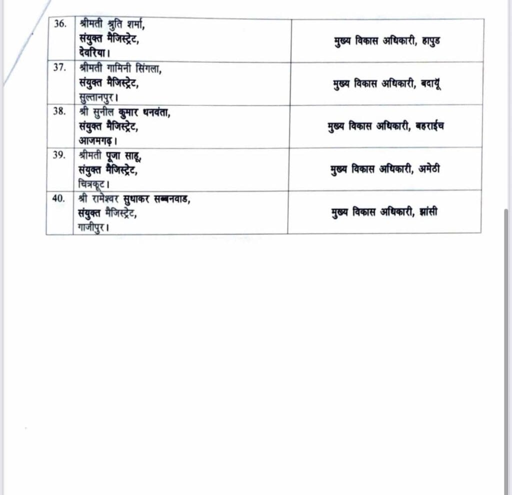 इसी प्रकार गामिनी सिंगला संयुक्त मजिस्ट्रेट सुल्तानपुर को मुख्य विकास अधिकारी बदायूं, सुनील कुमार धनवंता संयुक्त मजिस्ट्रेट आजमगढ़ को मुख्य विकास अधिकारी बहराइच, पूजा साहू संयुक्त मजिस्ट्रेट चित्रकूट को मुख्य विकास अधिकारी अमेठी, रामेश्वर सुधाकर सब्बनवाड संयुक्त मजिस्ट्रेट गाजीपुर को मुख्य विकास अधिकारी झांसी बनाया गया है.