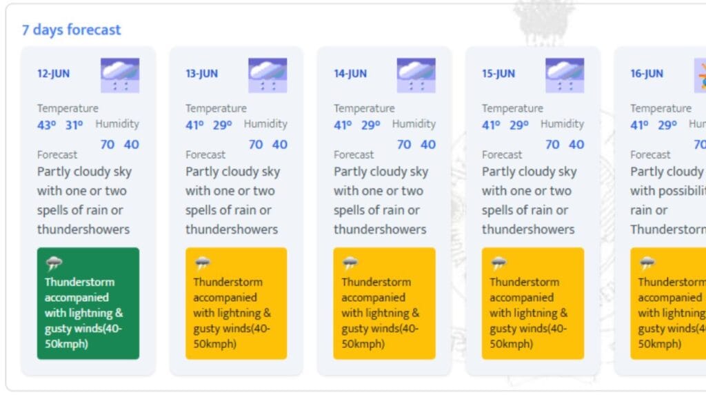 चिलचिलाती धूप और गर्मी से परेशान यूपी के लोगों को आने वाले 2 दिनों में इससे राहत मिलने के आसार हैं. मौसम वैज्ञानिक अतुल कुमार सिंह ने बताया कि 14 जून से मौसमी सक्रियता बढ़ने से यहां के कई जिलों में बारिश हो सकती है, जिससे लोगों को लू और गर्मी से थोड़ी राहत मिल सकती है. आज लखनऊ में अधिकतम तापमान 42 डिग्री सेल्सियस रह सकता है. मौसम विभाग के मुताबिक, 13-17 जून तक बिजली चमकने और तेज़ हवाएं के साथ तूफान आने की संभावना जताई गई है.